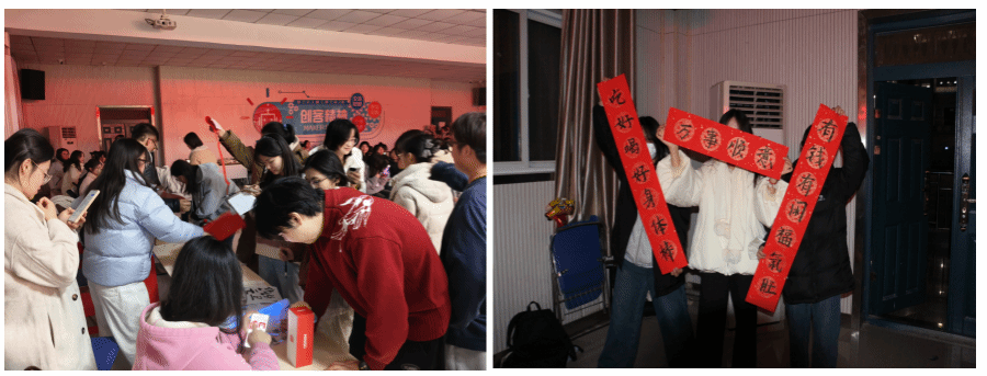 为增强互动体验,现场还特别设置了写春联、幸运抽奖等特色环节。同学们踊跃参与写春联活动,笔墨挥洒间勾勒出对新年的美好期许;抽奖环节悬念迭起,欢呼声不断,为联欢会增添了更多欢乐活力。